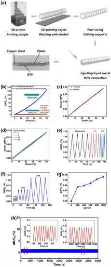 The linear bunch structure was fabricated using a photocuring 3D printer (AUTOCERA-L, Beijing Shiwei Technology Co., Ltd., Beijing, China). The elastic resin Agilus30 was used for molding, the molded sample was then placed in a beaker filled with alcohol, and the ultrasonic machine was used to ultrasound at 25 kHz and 25 °C for 10 min. The object after cleaning was put into the oven for drying for 5 min, and then the sample was post-cured for 20 min by a UV curing machine. After curing completely, the bracket was removed. We mixed gallium and indium in a mass ratio of 3:1, then heated the mixture in a water bath at 60 °C and stirred for 30 min to obtain a liquid metal (gallium indium alloy). A syringe was used to fill the liquid metal with a bunch-structured conductive network, and the elastic resin Agilus30 was used at both ends to fix the copper sheet and seal the port for easy testing.