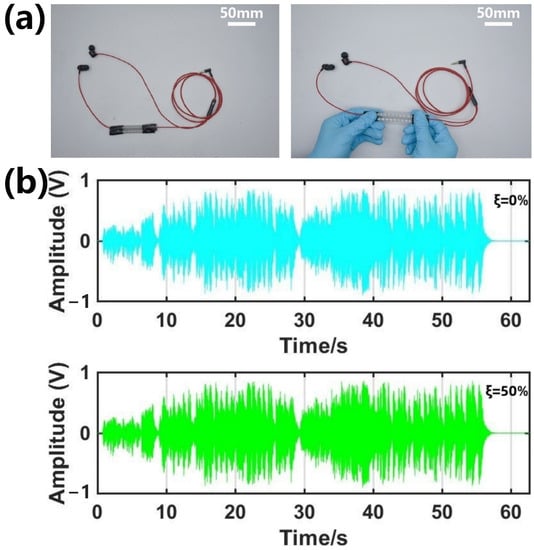 Part of the earphone cable was replaced with the prepared sample so that the two ends of the earphone wire were bonded to both ends of the sample by light-curing resin, and a stretchable earphone cable was obtained. To test the voltage waveform, an oscilloscope (710 110/DLM2024, Yokogawa, Tokyo, Japan) was connected in parallel with a speaker to record the music signal.