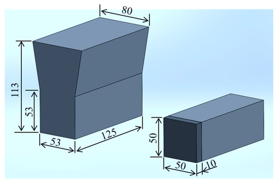 The alloys were designed using two kinds of MWCIs containing 5 wt.% Cr, Mo, W, and V and 5 wt.% Cr, Mo, W, and Nb, with three different C percentages (1, 1.5, and 2.0 wt.%). In total, we produced six types of material (hereafter referred to as 1C-5V, 1.5C-5V, 2C-5V, 1C-5Nb, 1.5C-5Nb, and 2C-5Nb). The chemical composition of the alloys was measured using SPECTROLAB (AMATEK, Inc., Berwyn, PA, USA) and the result is presented in Table 1. The manufacturing process of the materials was introduced in a previous study we conducted [29]. First, 50 kg of raw material was melted using a high-induction furnace and then poured into a Y sand block mold (Figure 1). Then, a high-speed precision-cutting machine (Refinetech Co., Ltd., RCA-234, Kanagawa, Japan) was used to cut the specimens into dimensions of 50 mm × 10 mm × 10 mm. The cutter allowed for a coolant to automatically flow through it to prevent the alteration of the alloy’s microstructure owing to the friction phenomena that can occur during the process.