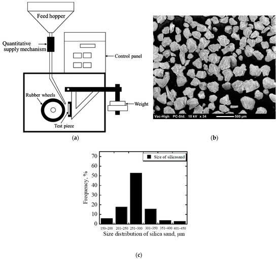 (a) Schematic drawing of the abrasion machine test; (b) image of the abrasive particle; (c) abrasive particle distribution size.