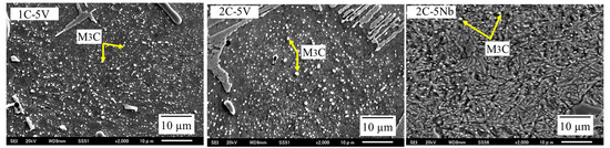 Higher-magnification microphotograph of the representative alloys. The precipitation of the secondary carbide (M3C) and martensite matrix (needle-like) on the microstructures of 1C-5V, 2C-5V, and 2C-5Nb.
