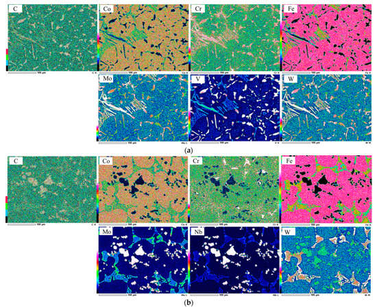 Figure 6 presents the distribution of each added element in the microstructure. It can be observed that V is mostly embedded in VC carbides, and Mo or W occupies M2C carbides in 5V alloys. However, Mo was simultaneously embedded with elemental Nb to form NbC and W to form M2C carbides. Since Mo also occupied the area of the NbC carbide, this might have been the reason for the larger size of the carbide compared to VC. Meanwhile, Co and Fe are mostly embedded in the matrix area.
