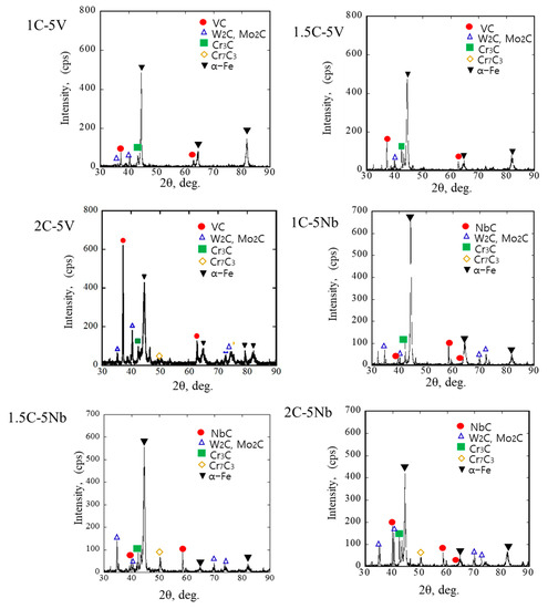 To obtain more detailed microstructure information, the investigation was continued using XRD. The results of each alloy are depicted in Figure 7. In the case of the 5V alloy, there were several types of indexed carbides. These included VC, W2C or Mo2C, Cr7C3, and Cr3C carbides. It can be observed that the peaks of VC, W2C or Mo2C, and Cr7C3 increase as the amount of C increases in the case of the 5V alloy. This might be due to the better opportunity of added transition metals with more C atoms to form VC, W2C or Mo2C, and Cr7C3 carbides. However, no peak shifting was identified as the amount of C content increased. In addition, only an alpha (α) phase was evident in the results, indicating that martensite is the main material matrix type. No differences in the carbide or matrix were observed as the percentage of C increased. In the case of 5Nb, NbC, W2C or Mo2C, Cr7C3 and Cr3C, and Cr7C3 carbides were present in the microstructure. Similar to the 5V alloy, the XRD peak of 5Nb alloys presented the same behavior where the peaks of NbC, W2C or Mo2C, and Cr7C3 increased as the C content increased. The higher peak of the carbides as the C content increases might contribute to the increment in the CVF, as previously explained. Moreover, only the alpha (α) phase was detected on the microstructure of 5Nb alloys. Meanwhile, the presence of retained austenite was difficult to detect in 5V and 5Nb alloys, which might be due to its very little amount. This means that the XRD data are in good agreement with the SEM-EDS data, as previously described.
