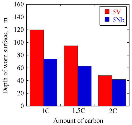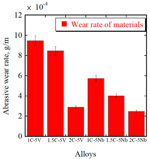 The average abrasive wear rate of each alloy is presented in a bar chart (Figure 8) with six repetitions of the test being performed. In the case of the 5V alloy, the wear rate decreased significantly as the percentage of C increased. The higher CVF and hardness values of the alloy as the amount of C increased probably contributed to the better wear resistance result. Therefore, 2C-5V has better wear resistance (wear rate: approximately 2.89 × 10−4 g/m), while the worst is 1C-5V (wear rate: approximately 9.47 × 10−4 g/m). The same condition was also implied in the case of the 5Nb alloy, where a higher percentage of C provided a better wear resistance result. Thus, the material with better wear resistance behavior is 2C-5Nb (wear rate: approximately 2.48 × 10−4 g/m) and the worst is the 1C-5Nb alloy (wear rate: approximately 5.73 × 10−4 g/m). This result is in agreement with several previous studies that determined that the greater the CVF and strength of the material, the better the wear resistance [7,27,29,35].