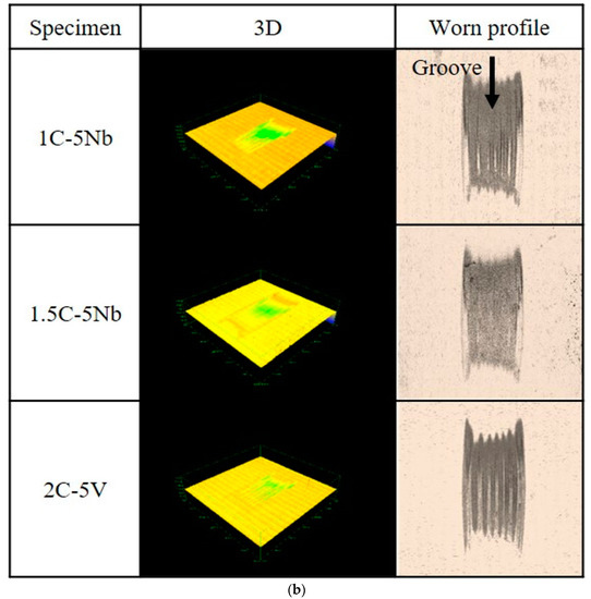 However, it is interesting to observe the comparison of both alloys (5V and 5Nb) with the same percentage of C. In the previous section, we clearly showed that there was no significant CVF difference between the 5V and 5Nb alloys. Moreover, the hardness of each alloy was also relatively similar. Meanwhile, the wear rate of 1C-5Nb was much lower than 1C-5V. In the case of 1.5C, the wear rate of 5Nb was also much lower compared to the 5V alloy. A minor difference can be observed for the case of 2C, where the wear rate of 5Nb was slightly lower than 5V. This means that materials with the same CVF and hardness values do not always guarantee the same wear resistance level. On the other hand, it can be argued that the CVF and hardness values are not always the main indicators for evaluating the wear performance of a material, which contrasts with the results of several previous studies [4,17,29].