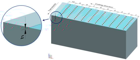 Immediately after the milling process, obtained parts were measured for their dimensional accuracy. To avoid errors associated with the change of mounting of the workpiece, measurements were taken on the machine tool with a TS 640 Heidenhain (Traunreut, Germany) workpiece touch probe. Measurements were taken in the Z-axis of the machine tool, as shown in the diagram in Figure 1. One hundred measurement points were evenly distributed over the entire machined surface.