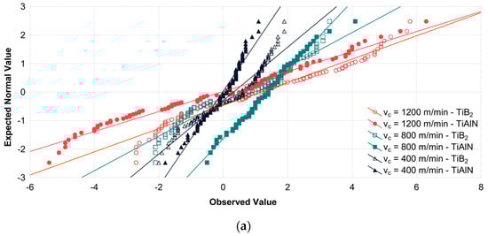 Diagrams illustrating the normality of data obtained from a milling process conducted with variable technological parameters using both cutting tools are also shown in the form of charts in Figure 2.