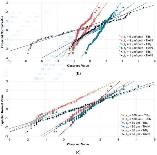 Assessment of data distribution normality using variable (a) cutting speed; (b) feed per tooth; (c) axial depth of cut.