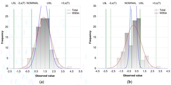 Process capability can be estimated based on pre-defined quality indices. One can distinguish indices for estimating short-term process capability (Cp, Cpk) and long-term process capability (Pp, Ppk), which are also called process performance indices. These indices always come in pairs—the first one defines the potential capability of a process, while the other one (with an index k) defines the degree of process centring and provides information about its real capability. Both types of indices are estimated almost identically, the only difference being the way in which standard deviation is determined. In the case of the Cp and Cpk indices, the process variability is determined in relation to individual measurement groups, whereas with the Pp and Ppk indices, overall variability is estimated for the entire process. The way of interpreting results is also the same for both groups of indices. The higher the index value is, the better the process capability becomes. The most widespread index levels used in industry are as follows: 1—fair, 1.33—good, 1.67—excellent, and 2—terrific [,,]. Although the generally accepted level is 1.33, the value depends on the nature of a given manufacturing process. For example, the largest companies from the automotive sector, where product quality is fundamental, take a value of 1.67 or even 2 as the minimal value [,]. Naturally, these are only conventional thresholds, and companies can adjust their values to suit individual needs. Nonetheless, the proposed values follow directly from the properties of the normal distribution to which analysed data should be subjected and the 6-sigma principle [,]. The range of ±3σ from the mean value contains about 99.73% of all results; hence for the capability index equal to 1, the defect rate is 0.27% of products. The defect rate decreases with increasing process capability. By narrowing the process variability to 50% of the assumed tolerance range (the capability index equal to 2), it is possible to reduce the defect formation risk to 0.002 ppm (parts per million) [,]. However, the selection of the desired process capability level should also depend on economic aspects [,]. Process capability indices refer to only one variable, while multiple product properties are usually controlled. The total probability of product compliance is, therefore, the quotient of indices for all monitored variables. A number of variables can also be estimated based on specifically designed indices [,,].