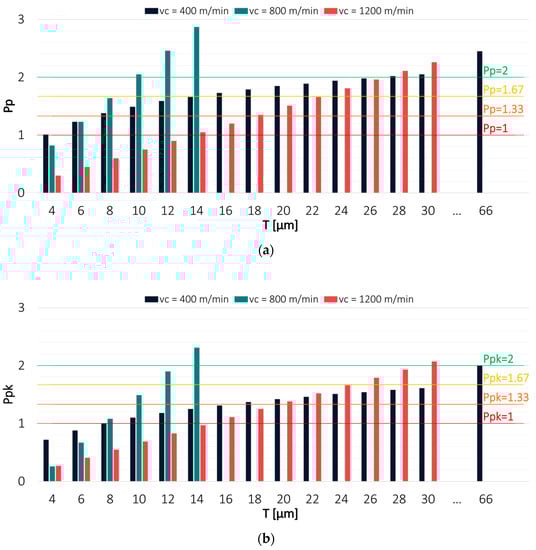 Values of (a) Pp and (b) Ppk for the results obtained in a milling process conducted with variable cutting speed and TiAlN-coated tool.