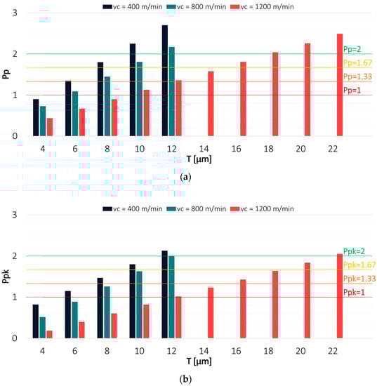 Values of (a) Pp and (b) Ppk for the results obtained in a milling process conducted with variable feed per tooth and TiAlN-coated tool.