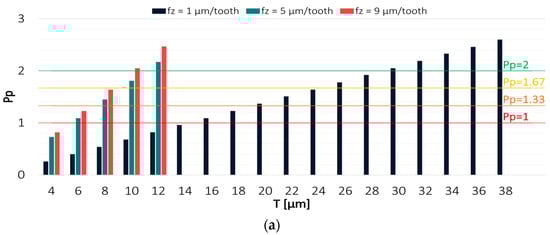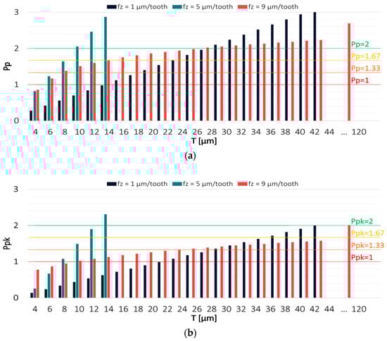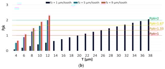 Figure 6 and Figure 7 show the values of Pp and Ppk indices for the results obtained from a milling process conducted with variable feed per tooth. The highest process capability was achieved when machining was carried out using the TiAlN-coated tool with intermediate values of technological parameters. Considerably worse results were obtained with the extreme values of feed per tooth. For the feed per tooth fz = 1 µm/tooth, the Pp index exceeded a value of 2 at a tolerance of 30 µm; however, due to a relatively large displacement of the scatter field relative to the tolerance range, the Ppk index exceeded the desired level only at T = 44 µm. Significantly reduced centring and, at the same time, the lowest process capability were obtained in a milling process conducted with the highest feed per tooth value of fz = 9 µm/tooth, where the Ppk index reached a value of 2 only at a tolerance of 120 µm, in spite of the fact that the Pp index already achieved this value at T = 20 µm.