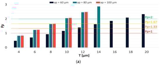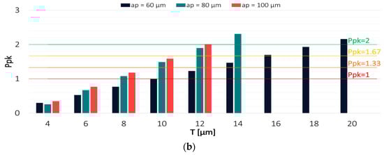 Regarding the TiB2-coated tool, the highest process capability was achieved when milling was conducted with the lowest depth of cut ap = 60 µm. The highest values of Pp and Ppk were obtained with tolerances of 8 µm and 10 µm, respectively. For the depths of cut ap = 80 µm and ap = 100 µm, the tolerance had to be increased to 12 µm in order to achieve a Ppk value that would be greater than 2. This demonstrates that the variable axial depth of cut had even less effect on the results when the milling process was conducted with the TiB2-coated tool.