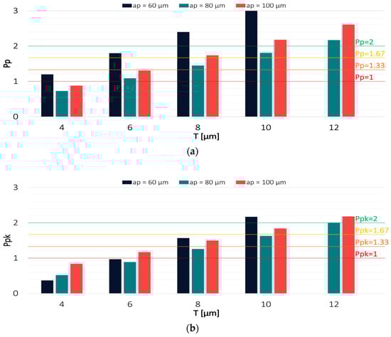 Values of (a) Pp and (b) Ppk for the results obtained in a milling process conducted with variable axial depth of cut and TiB2-coated tool.