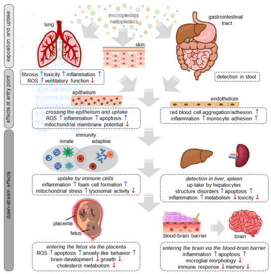 In the last section, we turn to the effects of MP/NP on immune cells that are known to date. Independent of the entry route via the skin, lung, or intestine, MP/NP may encounter immune cells such as macrophages, which are resident in almost all organs and tissues, including those discussed here and which are responsible for innate immune mechanisms [52].