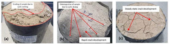Cracking after different numbers of wetting–drying cycles was obtained in the subgrade [47]. According to the British lime association [48], more moisture loss was observed through evaporation due to heat generated during the hydration and pozzolanic reactions synonymous with soil stabilisation using cement, lime and GGBS. Two stages of crack development at the end of the drying process of the high-plasticity-index subgrade were observed-the stage of rapid crack growth and the stage of steady crack development, these stages affect the strength of the soil while reducing the soil mass [47]. This behaviour is very common in naturally existing high-plasticity-index subgrade materials when subjected to high temperatures, especially in tropical areas. When oven-dry samples were submerged in water during the wetting cycle process, water, with a higher density, quickly occupied the pores, expelling the air from within the sample hence increasing the mass of the sample as shown in Figure 1a–c. Figure 2 and Figure 3 show the gradual reduction in sample mass for subgrade materials as the number of cycles increases.