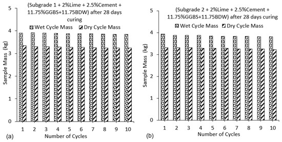(a) Wetting–drying cycle results for subgrade 1 composed of GGBS and BDW after 28 days of curing. (b) Wetting–drying cycle results for subgrade 2 composed of GGBS and BDW after 28 days of curing.