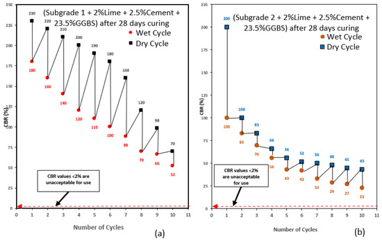 This was due to the high amount of bentonite content in the mix, making it expansive and weak in compression. According to [12], subgrade materials with high bentonite content have low CBR values. Subgrade mix design composed of high GGBS content (23.5%) recorded the highest CBR values for wetting–drying cycles, making it the best performing mix in this study. The high strength values achieved with the addition of high amounts of GGBS in the mix supports some of the results presented by [12], which is because the relatively high calcium content in GGBS, the main reaction product of CSH gel is responsible for the increase in strength in a mix [51]. Studies have shown that the higher the amount of GGBS blends, the greater the strength and durability of the mix [52]. This shows that subgrade material treated with 23.5% GGBS can withstand many wetting–drying cycles and still maintain very high CBR values required for use in road construction. The addition of equal proportions of GGBS and BDW exhibited good CBR values usable in road construction at the end of the wetting–drying cycle process. BDW are pozzolanic materials with high alumina/silica content which in the presence of lime can form cementitious gel to increase strength in a mix [53]. Previous studies have also shown that the addition of brick dust increased soil strength by 1.7 to 2.3-fold [51,54]. The lowest CBR value recorded for subgrade 1 composed of 23.5% GGBS was 70% after 10 drying cycles and 52% after 10 wetting cycles. Subgrade 2 composed of 23.5% GGBS recorded a CBR value of 43% after 10 drying cycles and 23% after 10 wetting cycles. Subgrade 1 composed of equal amounts of 11.75% GGBS and 11.75% BDW recorded a CBR value of 58% after 10 drying cycles and 16% after 10 wetting cycles. Subgrade 2 composed of equal amounts of 11.75% GGBS and 11.75% BDW recorded a CBR value of 19% after 10 drying cycles and 15% after 10 wetting cycles. The result shows that CBR values achieved for all subgrades after 10 wetting–drying cycles are very good exceeding minimum 2%, making them suitable for use in road construction. Hence, expansive subgrade materials treated with GGBS and BDW are highly durable and can withstand harsh weather conduction without losing their strength. Figure 4 and Figure 5 show CBR results for subgrade materials after wetting–drying cycles.