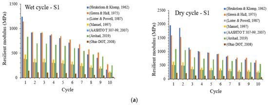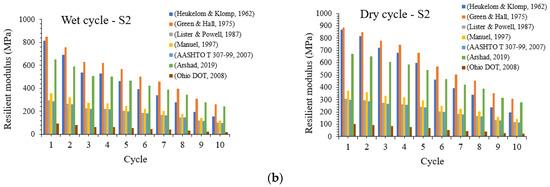 As indicated in Figure 6, the resilient modulus seems to be generally decreasing with increasing cycles of wetting and drying for stabilised subgrades 1 and 2 without BDW. Across the estimated resilient modulus, values for subgrade 1 are all greater than those for subgrade 2. Moreover, for both wetting and drying cycles, the expression proposed by [62,64] seem to give upper and lower bound values of the resilient modulus, respectively. Meanwhile, the resilient modulus proposed by [61] seem almost indistinguishable. It could also be noticed that the resilient modulus derived from [55,59,60,61,62,63,64] all seem to remain unchanged with the increasing number of wetting and drying cycles especially for stabilised subgrade 1. A similar decreasing trend in the resilient modulus with increasing cycles of wetting and drying is observed for stabilised subgrades 1 and 2 with the inclusion of BDW as shown in Figure 7a,b.