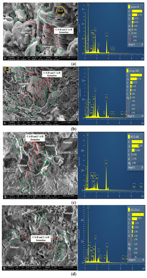 Microstructural analysis conducted showed a high formation of the calcium silicate hydrate (CSH) gel responsible for the increase in strength. Recent studies [53,65] have pointed out that the addition of GGBS and BDW increases the formation of CSH gel due to the rich calcium and pozzolanic characteristic of GGBS and BDW combination. From the result of energy dispersive x-ray analysis, as shown in Figure 8a–d, a calcium (Ca) content of 44.87% was recorded for subgrade 1 treated with the addition of 23.5% GGBS after 28 days of curing. Subgrade 1 composed of 11.75% GGBS and blended with 11.75% BDW recorded 32.73% calcium (Ca) after 28 days of curing. Subgrade 2 composed of 11.75% GGBS and blended with 11.75% BDW recorded 36.78% calcium (Ca) after 28 days of curing. Detailed results of SEM and EDX analysis conducted in this study are shown in Figure 8a–d. From the EDX results, the higher calcium content of subgrades 1 and 2 treated with 23.5% GGBS in combination with lime and cement is logical since GGBS has a higher calcium content, which was further increased with the addition of 2% lime and 2.5% cement. The increase in calcium, however, might not have sustained the increase in strength as calcium alone is insufficient for production of CHS obviously. Reasonable quantities of Si and Al are required to enhance the production of cementitious products. This is seen in the results of the samples with the addition of 11.75% BDW and is an indication of the growth of more cementitious products as shown in Figure 8a,b.