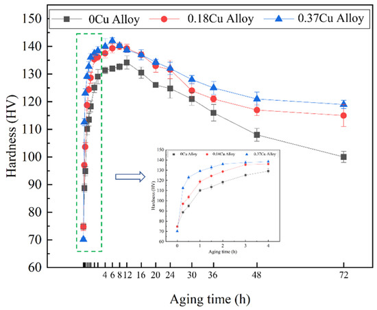 - Cu enhanced the artificial aging hardening response and improved the tensile properties of the Al-1.2Mg-1.2Si-(xCu) alloy. With the increase in Cu, the time to reach peak aging decreased which was 12 h of 0Cu alloy, 10 h of 0.18Cu alloy, and 8 h of 0.37Cu alloy. In addition, their tensile strength was 421 MPa, 448 MPa, and 459 MPa, respectively.