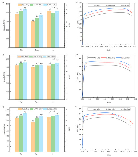 - Cu addition promoted the precipitation of enhanced phases. With the increase in Cu, the number density of precipitates was increased from 0.23 × 1023/m3 to 0.73 × 1023/m3, and the volume fraction of precipitates was increased from 0.27% to 0.59% in the initial aging stage. The number density of precipitates was increased from 1.9 × 1023/m3 to 5.5 × 1023/m3 and the volume fraction of precipitates was increased from 4.05% to 5.36%. Accordingly, the tensile strength of the alloy was promoted with the increase in Cu.