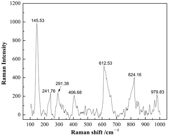 TiO2 passivation film on titanium alloy surfaces has three crystal structures: rutile, anatase, and brookite [10]. Figure 1 shows the Raman spectra of TiO2 film on TC4 alloy, and Table 1 shows the frequency shift positions of Raman spectral characteristics of three crystalline TiO2. The four peaks, 145.53 cm−1, 241.76 cm−1, 612.53 cm−1, and 824.16 cm−1 in Figure 1, are consistent with the corresponding peak value of the rutile TiO2 in Table 1. Some scholars found that the composition of titanium alloy passivation film was rutile TiO2 [11]. Therefore, rutile TiO2 was selected as the research object in this paper.