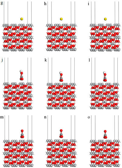 Interface model of TiO2100) including corrosive ions. (a) TiO2(100)-Cl−(top); (b) TiO2(100)-Cl−(bridge); (c) TiO2(100)-Cl−(hole); (d) TiO2(100)-HS−(top); (e) TiO2(100)-HS−(bridge); (f) TiO2(100)-HS−(hole); (g) TiO2(100)-S2−(top); (h) TiO2(100)-S2−(bridge); (i) TiO2(100)-S2−(hole); (j) TiO2(100)-HCO3−(top); (k) TiO2(100)-HCO3−(bridge); (l) TiO2(100)-HCO3−(hole); (m) TiO2(100)-CO32−(top); (n) TiO2(100)-CO32−(bridge); (o) TiO2(100)-CO32−(hole).