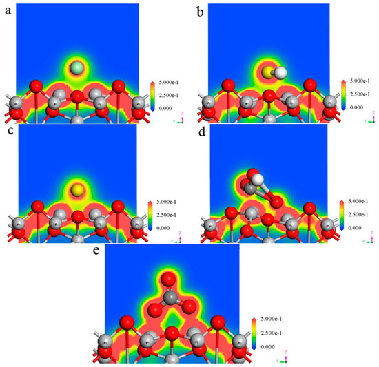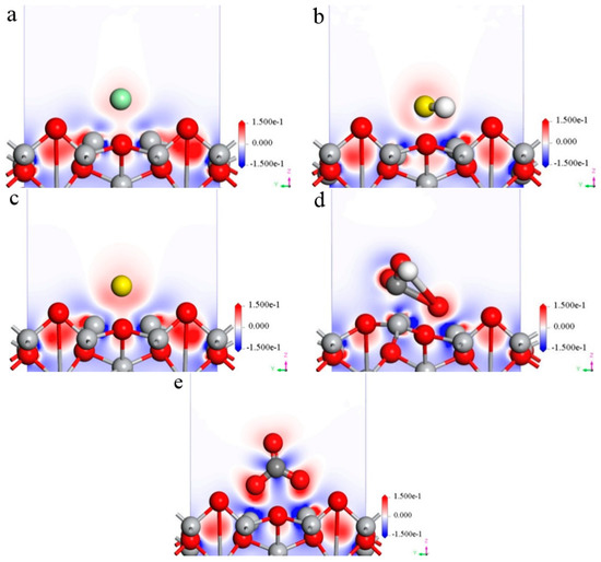Figure 4 shows the charge density of the corrosive ions (Cl−, HS−, S2−, HCO3−, and CO32−) at the bridge site of the TiO2(100) under the stable state adsorption. It could be seen that a very distinct charge transfer appearance was presented between Cl, S, O, and Ti atoms which was in the Cl−, HS− and S2−, HCO3− and CO32−, and TiO2(100) surfaces, respectively. Charge segregation and electronegativity decreased near Cl, S, and O atoms, while charge dissipation and electronegativity increased near the Ti atom in TiO2 [17]. Therefore, the interface binding energy between Cl, S, O, and Ti atoms was in the Cl−, HS− and S2−, HCO3− and CO32−, and TiO2(100) surfaces, respectively. Finally, the specific charge transfer process moved from the Ti atom on the TiO2(100) surface to Cl, S, and O atoms.