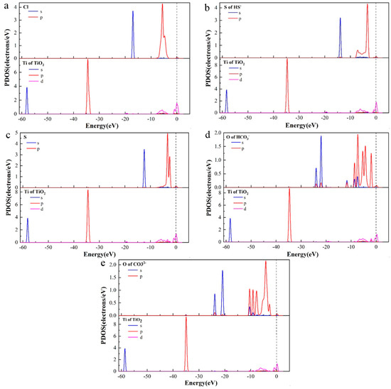 PDOS curves of (a) Cl−, (b) HS−, (c) S2−, (d) HCO3−, and (e) CO32− adsorbing on the TiO2(100) surface at the bridge site.