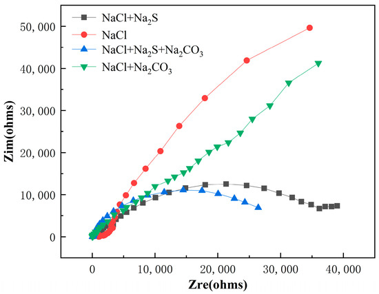 The alternating-current impedances of TC4 alloy in NaCl, NaCl + Na2CO3, NaCl + Na2S and NaCl + Na2S + Na2CO3 solutions containing saturated CO2 are shown in Figure 6. It could be seen that the radius of the capacitive arc of TC4 alloy in four corrosive solution was NaCl > NaCl + Na2CO3 > NaCl + Na2S > NaCl + Na2S + Na2CO3. The radius of electrochemical Nyquist impedance spectroscopy can determine the corrosion resistance of materials; the larger the radius of the electrochemical Nyquist impedance spectrum is, the stronger the corrosion resistance of materials to local corrosion is [21]. Therefore, the corrosiveness of four corrosive solutions to TC4 alloy was NaCl + Na2S + Na2CO3 > NaCl + Na2S > NaCl + Na2CO3 > NaCl.