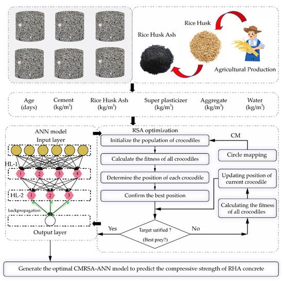 Flowchart of generating CMRSA–ANN model to predict the compressive strength of RHA concrete.