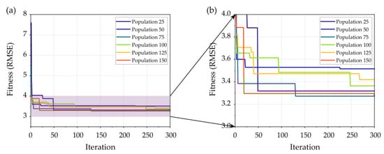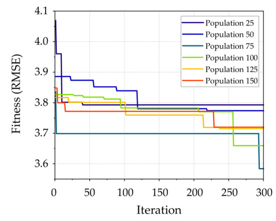The development of the SOA–SVM model is similar to that of the CMRSA–ANN model. For the SVM model, two main hyperparameters, the regularization parameter (C) and kernel coefficient () of the used kernel function, are key players to improving the model performance [74,75]. In this paper, the popular radial basis function (RBF) was considered as the kernel function of the SVM model. To determine the optimal hyperparameter combination of the SVM model, the range of these parameters was 0 to 100. Thew population sizes and iteration number of SOA were set to be the same as those of the CMRSA. The development results of the SOA–SVM models are shown in Figure 4. The best SOA–SVM model had a population of 75 in the training phase and had a lower fitness value of RMSE than that of other models.