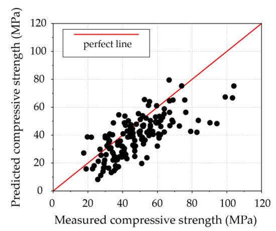 The most accurate strength measurement method of concrete is the compressive test in the laboratory. However, the production and maintenance of concrete samples is complicated and time-consuming, and wastes workers and material resources [30]. For example, a group of experiments require two to three professionals to complete. In order to improve calculation efficiency and site limitation, a method based on an empirical formula was developed to estimate compressive strength that was especially praised by field workers. Islam et al. [31] developed an empirical formular by using the least-squares approach to calculate the compressive strength of RHA concrete. Their results showed that the formular achieved good predictive performance with a correlation coefficient (R) of 0.816. Liu et al. [32] utilized six empirical equations to estimate the compressive strength of concrete containing RHA with different replacement values. However, the limitation of the empirical formula is that it cannot accurately express the complex nonlinear relationship between the considered parameters and compressive strength [33].
