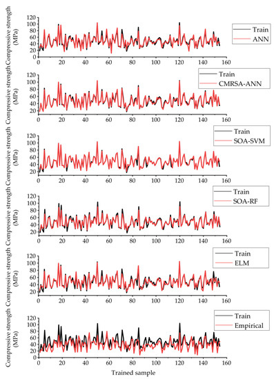 After training the proposed models, the predictive performance of each model was properly evaluated. Figure 7 shows the prediction curves of all models for estimating the compressive strength of RHA concrete in the training phase. The difference between the prediction curve of the empirical model and the training curve was the greatest among all models. The similarity between the prediction curves of three hybrid models and training was relatively higher, especially in the CMRSA–ANN model.