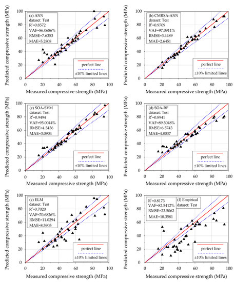 Regression relationships can also be used to evaluate and compare the predictive performance of models. Figure 8 shows the regression results of each model using the test set. In each regression plot, one perfect and two limited lines were used to evaluate the regression relationship between the values from the prediction model and the measured values. For instance, the data point determined by the best model with a prediction accuracy of 100% could lie on the perfect line. Observations based on this criterion show that the CMRSA–ANN model achieved better predictive performance than that of other models, indicated by the greater number of data points close to the perfect line and within the limited lines. Furthermore, the performance of the SOA–SVM and SOA–RF models was better than that of the ANN, ELM, and empirical models, but they could not perform accurate predictions for small values of compressive strength (less than 30 MPa).