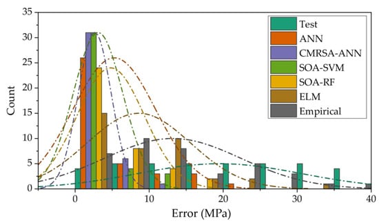 For the regression problem, the error between the predicted and measured values was one of the most concerning performance indices. Although perfect predictions rarely exist, one of the purposes of training and testing is to shrink the prediction error of each target as much as possible. The measured and predicted values of the compressive strength of RHA concrete are listed in Table 6. Figure 9 illustrates the error distribution of each prediction model in the testing phase. The error by the CMRSA–ANN model was mainly concentrated within 10 MPa and accounted for the highest proportion within 5 MPa. The error distribution of the SOA–SVM model was similar to that of the CMRSA–ANN model in a small range where the error was less than 10 MPa, while there were some larger errors between 10 and 15 MPa. The error distribution from the empirical model was undoubtedly the most unsatisfactory, as it both accounted for the lowest proportion of small errors and had many excessive errors.