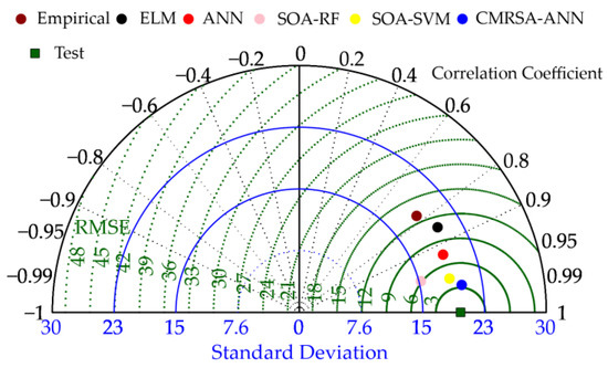 Taylor diagrams are used in visually comparing the predictive performance of multiple models. In a Taylor diagram, a model with high prediction accuracy is close to the position of the target value. The position of each model is determined with three indices, i.e., St. D., RMSE, and R. Therefore, the model performance can be evaluated and compared with multiple indices. Figure 10 displays the evaluation results of all developed models in the Taylor diagram. The CMRSA–ANN model was the closest to the position of the test set. Following this model, models sorted by distance are SOA–SVM, SOA–RF, ANN, ELM, and empirical. These results indicate that the CMRSA optimization algorithm is successful in improving the predictive performance of ANN models. The optimized SVM and RF models had better predictive accuracy than that of the unoptimized ANN and ELM models. Therefore, it is feasible to use the hybrid optimization model to predict the compressive strength of RHA concrete. CMRSA–ANN was selected as the optimal model in this paper.