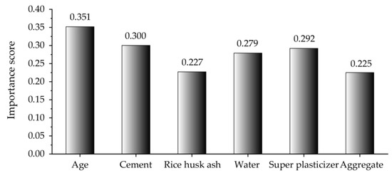 Nevertheless, the importance or sensitivity of each input parameter to the prediction of compressive strength is unknown, which is detrimental to further improving concrete properties. Therefore, sensitivity analysis was conducted to evaluate the impact of each input parameter on the output. In this paper, calculation method PAWN, proposed by Pianosi and Wagener [77,78], was adopted to calculate the importance score of the input parameters. Figure 11 illustrates the sensitivity results of the compressive strength prediction of the CMRSA–ANN model. Age was the most important parameter, with the highest score (0.351), for predicting the compressive strength of RHA concrete. After age, parameters ranked by influence are cement (0.300), the superplasticizer (0.292), water (0.279), RHA (0.227), and the aggregate (0.225). This result is consistent with that obtained by Iftikhar et al. [57].