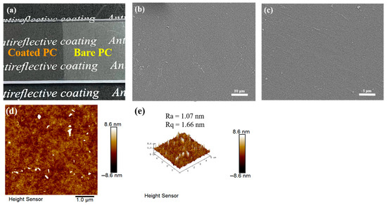 (a) Photos of the bare and coated PC, (b,c) SEM images, and (d,e) AFM surface topography and 3D images of the PFTS-modified 0.5 g ZrO2-SiO2 sample.