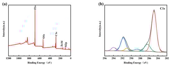 XPS spectra of the PFTS-modified 0.5 g ZrO2-SiO2 sample. (a) XPS survey; (b) C1s; (c) F1s; (d) O1s; (e) Si2p; (f) Zr3d.