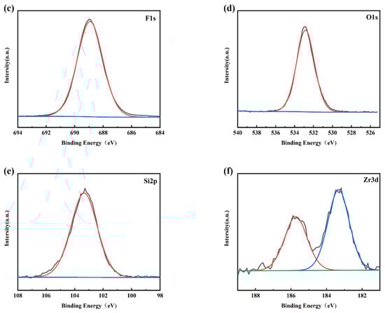 Figure 4a shows the XPS survey spectra of the PFTS-modified 0.5 g ZrO2-SiO2 sample; the peaks of F, O, C, and Si can be clearly observed. Figure 4b–f shows the high-resolution XPS spectra of C1s, F1s, O1s, Si2p, and Zr3d. For the C1s spectrum, its five peaks are: -C-C (248.80 eV), -C-O (286.29 eV), -C=O (288.65 eV, 290.88 eV), -CF2 (291.80 eV), -CF3 (294.20 eV). As is well known, the presence of silanol (Si-OH) groups leads to a large number of hydroxyl groups (-OH) on the surface of the hybrid coating, and the abundant hydroxyl groups (-OH) also provide conditions for their reaction with PFTS. As shown in the high-resolution spectra presented in Figure 4b,c, the C1s peaks observed at 291.80 eV and 294.20 eV and the F1s peaks observed at 688.2 eV [41] could be attributed to the -CF2 and -CF3 bonds. Such findings provide clear evidence of the successful modification of PFTS onto the surface of the hybrid coating. The formation of fluorocarbon molecules leads to a low surface area, which corresponds to the low surface energy required to achieve hydrophobicity. Peak 532.74 eV of the O1s spectrum and peak 103.23 eV of the Si2p spectrum correspond to -Si-O. The XPS spectrum of Zr element has two peaks, namely Zr3d5/2 peak at 183.3 eV and Zr3d3/2 peak at 185.7 eV, which correspond to the binding energy of ZrO2 according to the standard spectrum. As shown in Figure 4e,f, the high-resolution spectra of Si2p and Zr3d successfully indicate the hydrolysis of TEOS and the success of the hybrid coating of ZrO2.