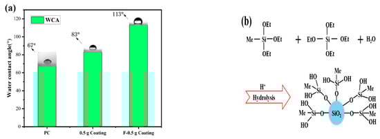 (a) WCA of the bare PC, the coating before and after PFTS modification, (b) Diagram of MTES/TEOS hydrolysis process, (c) Schematic illustration of the mechanism of surface hydrophobicity.