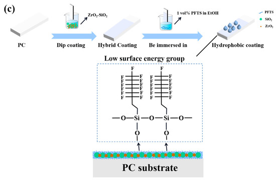 Polycarbonate (PC, 60 mm × 25 mm × 2 mm) was purchased from a local plastic factory and used as the substrate material. (Nanjing, China). Zirconium oxide sol (15 wt%) was purchased from Anhui Xuancheng Jingrui Co. (Xuancheng, China). Tetraethyl Orthosilicate (TEOS, 98%, AR) was purchased from Macklin Co. (Shanghai, China). Acetic acid (CH3COOH, 36%, AR) was purchased from Aladdin Co. (Shanghai, China). Anhydrous EtOH was purchased from Shanghai Lingfeng Co. (Shanghai, China). Methyltriethoxysilane (MTES, 98%, AR) was purchased from Aladdin Co. (Shanghai, China). 3-Glycidoxypropyltrimethoxysilane (GPTMS, 98%, AR) was purchased from Aladdin Co. (Shanghai, China). 1H, 1H, 2H, and 2H-perfluorooctyl trichlorosilane (PFTS, 97%) was purchased from Macklin Co. (Shanghai, China). The water was deionized water with a resistance of 18.25 Ω cm−1. All the chemical reagents were used directly without further purification.