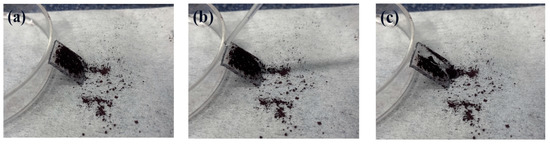 Figure 5a shows the WCA of the coating. Due to the presence of MTES in the coating, several hydrophobic methyl groups will exist on the surface of the coating, as shown in Figure 5b. The WCA of the coating increased from 67° to 83° because of the hydrophobic methyl groups. There were a large number of hydroxyl groups on the surface of the coating, which provided the reaction center for the surface modification. During the modification process of the PFTS solution, the PFTS hydrolyzed and condensed with the hydroxyl group on the surface of the coating to form a low surface energy film, which improves the hydrophobicity (113°) of the coating, as shown in Figure 5c. As shown in Figure 6a–c, the ferric oxide powder was spread on the coating surface. The water droplets rolled on the surface and picked up most of the solid particles to clean the surface, thereby demonstrating that the PFTS-modified coating possesses a certain self-cleaning ability.