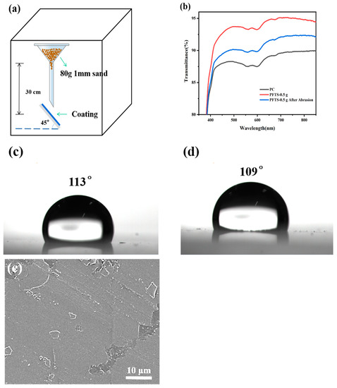 A sand hit test was conducted on the coated PC, and a sand grain with a particle size of about 1 mm was used to hit the coated PC from a height of 30 cm in free fall, as shown in Figure 8a. Figure 8b shows the transmittance of the PFTS-modified 0.5 g ZrO2-SiO2 sample coated PC after the sand hit test. An observation can be made that although the transmittance was reduced after the sand hit test, the transmittance was still higher than that of the bare PC. Figure 8c,d shows the WCA of the PFTS-modified sample after the sand hit test. An observation can be made that the WCA of the sample did not change greatly, indicating that the coating still had good hydrophobicity. As shown in Figure 8e, a local peeling phenomenon was observed on the coating; however, this did not result in significant cracking or peeling of the coating. Such findings suggest that the coating exhibits a certain degree of stability, robustness, and impact resistance.