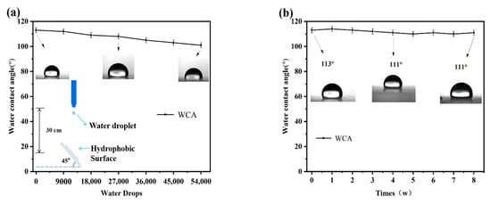 To further investigate the mechanical stability of the hydrophobic coating surface, water-drop impact simulation experiments were conducted on the PFTS-modified 0.5 g ZrO2-SiO2 sample. The schematic diagram of the water-drop impact test is shown in Figure 10a. The coating maintained hydrophobicity after 54,000 water droplet impacts, indicating that the coating could withstand the test and has good resistance to water droplet impacts. Figure 10b shows the effect of exposure time on the WCA of the surface. The PFTS-modified 0.5 g ZrO2-SiO2 sample coated PC was exposed to air to check its stability under natural aging conditions. After 8 weeks of exposure to air, the WCA of the coating did not change significantly, indicating that the hydrophobic coating has good durability and stability.