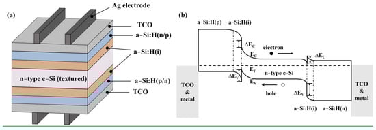 Heterojunction was first proposed in 1948 []. In 1974, Fuhs et al. [] first proposed the preparation of heterojunction structures through the deposition of amorphous silicon onto silicon single crystals. The most important feature is that the advantages of crystalline silicon and thin film cells were combined. Sanyo (now acquired by Panasonic) was a pioneer in applying the a-Si:H(i) thin film to a-Si:H/c-Si heterojunction solar cells []. The insertion of an a-Si:H(i) layer greatly reduces the recombination of interfacial carriers and thus improves the PCE []. The schematic structure of a SHJ solar cell is shown in Figure 1a. After texturing and cleaning, a-Si:H(i) layers are deposited on both sides of the silicon wafer. Boron-doped amorphous silicon (a-Si:H(p)) thin film is then deposited on the front or back side to form the emitter, which creates a p-n junction with the substrate to induce band bending, thereby enabling charge separation []. a-Si:H(n) thin film is deposited on the other side of the wafer to form a back or front surface field (BSF or FSF), which serves to repel minority carriers, thereby reducing carrier recombination []. As shown in the band diagram (Figure 1b), band offsets are present at each a-Si:H/c-Si interface []. The discontinuity at the conduction band edge (EC) is equivalent to the difference in electron affinity (χc-Si = 4.05 eV and χa-Si:H = 3.9 eV), whereas the discontinuity at the valence band edge (EV) is contingent upon the difference in electron affinity and band gap []. As a result, there is a large band offset at the valence band edge (~0.36 eV) and a small band offset at the conduction band edge (~0.15 eV) []. After the deposition of the doped amorphous film, transparent conductive oxide (TCO) layers are deposited on each side as the anti-reflection layer and lateral conducting layer. Finally, electrode fabrication methods, such as screen printing, in which low-temperature curing silver pastes are usually printed, are applied. Due to the high bifacial capability (up to 95%) [,], simple and low-temperature process [,,], and superior temperature coefficient [], SHJ solar cells continue to attract interest in the field of high-efficiency solar cells.