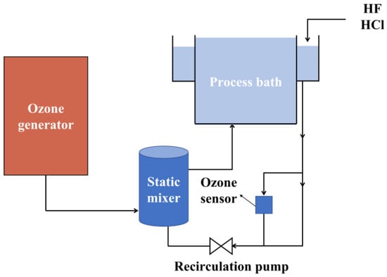 Ozone (O3) dissolved in deionized water possesses strong oxidizing properties and can be utilized alone to eliminate organic contaminants []. A mixture of ozone and acidic solvent (for example, HF and/or HCl) is effective at removing organic and metallic contaminations [,]. Figure 2 shows an ozone-based cleaning system, in which ozone is generated by a generator and mixed with acidic solvent in the static mixer []. The mixed O3/HF/HCl solution is then fed into the process bath through a recirculation pump. The temperature of the solution is monitored by a temperature detector in a process bath, while the ozone concentration is regulated by an ozone sensor.