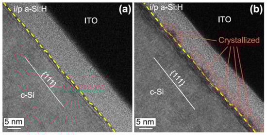Cross-sectional TEM images of the interfaces between i/p a-Si:H and c-Si of the SHJ solar cells: (a) stack of less dense a-Si:H(i1) layer and dense a-Si:H(i2) layer, (b) single dense a-Si:H(i2) layer []. The crystallized interface indicates the epitaxial growth in the condition of a single dense a-Si:H(i2) layer.
